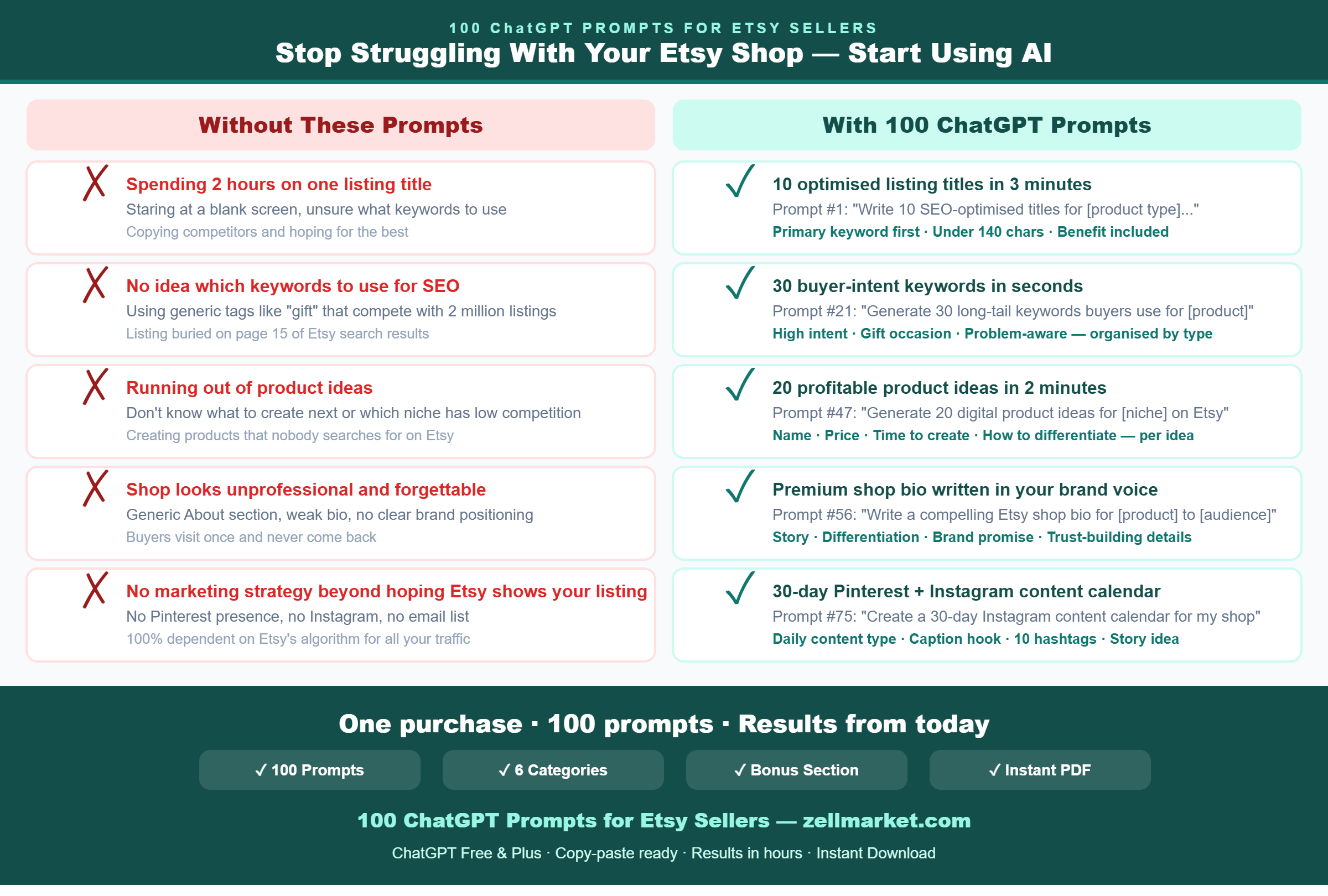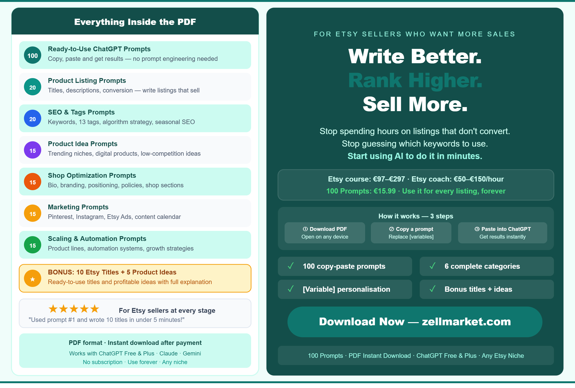 100 ready-to-use ChatGPT prompts for Etsy sellers. Write better listings, rank higher with SEO, find profitable product ideas, and grow your shop with AI. Includes BONUS: 10 Etsy titles + 5 product ideas. PDF instant download.
