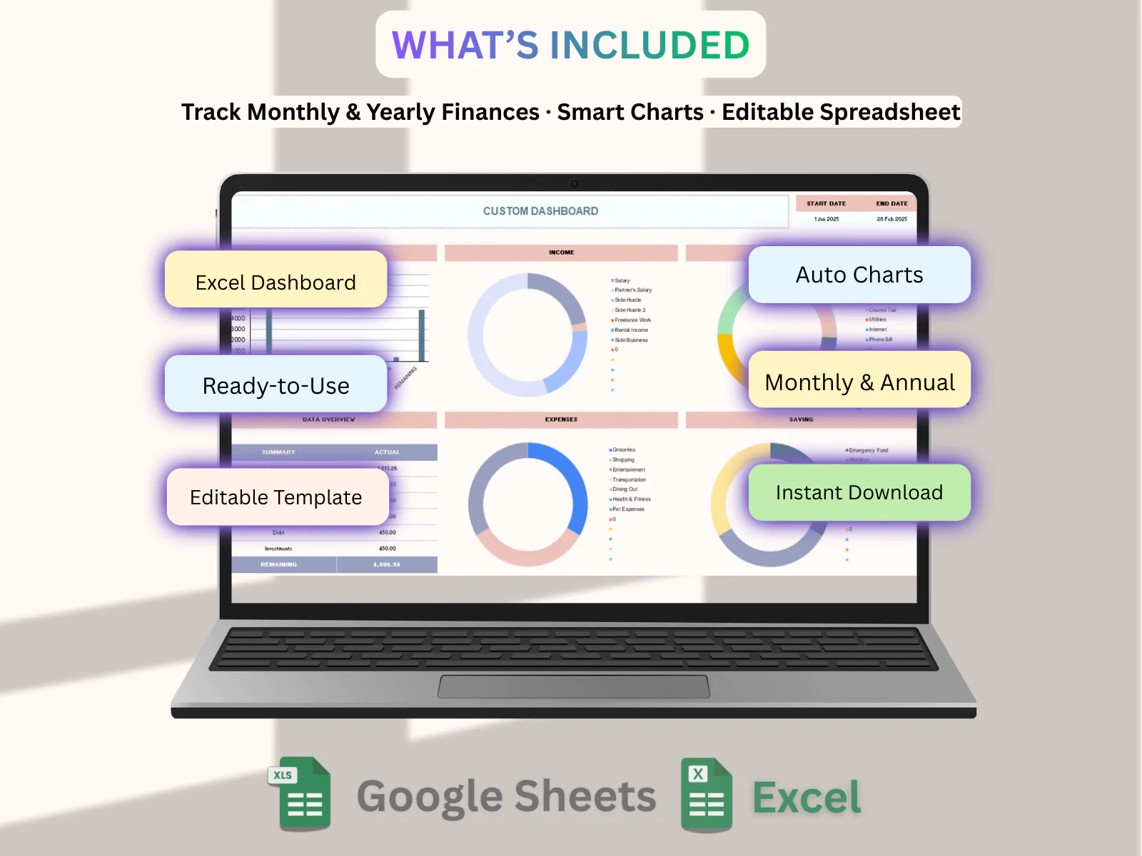 ake control of your finances with this easy-to-use Budget and Expense Tracker Spreadsheet. This template helps you organize income, track expenses, and understand your monthly spending in one simple dashboard.
