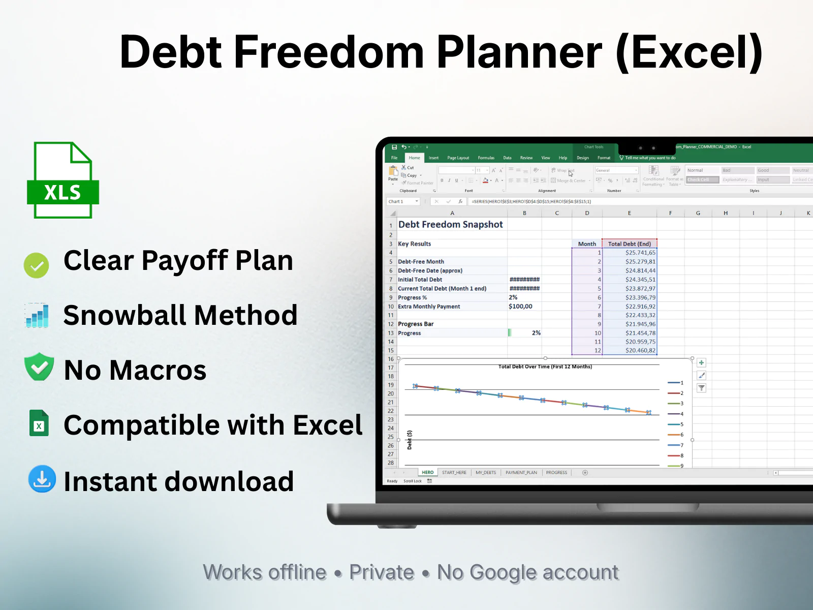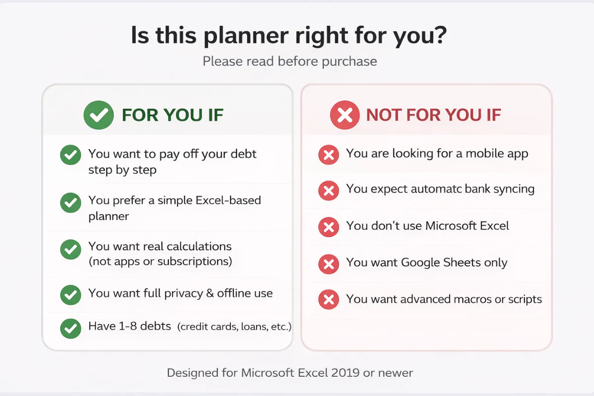 The Debt Freedom Planner (Excel) is a professional, easy-to-use spreadsheet designed to help you pay off debt faster using the proven Snowball Method — without complicated formulas or risky macros.
