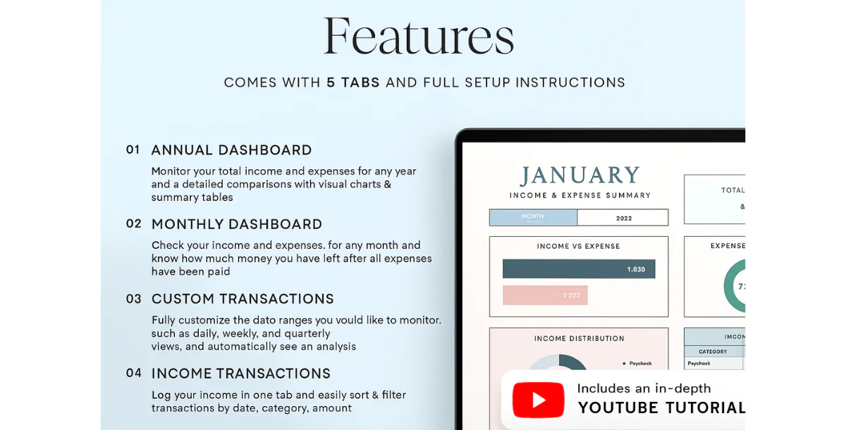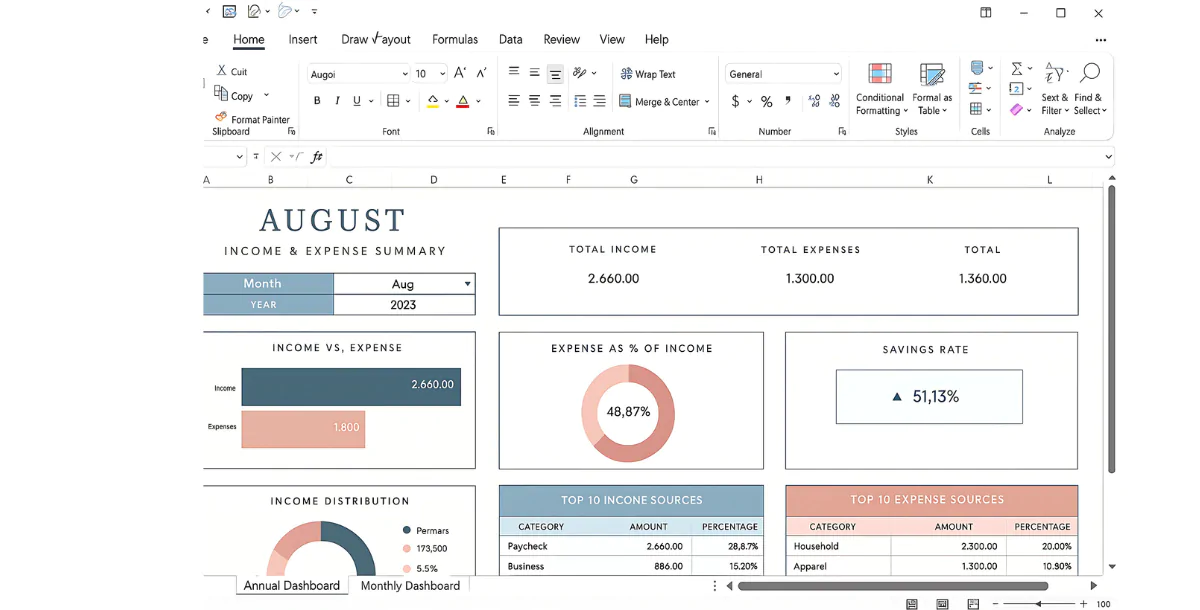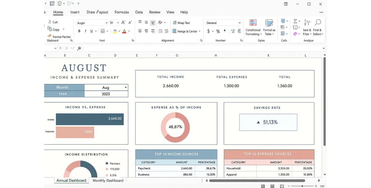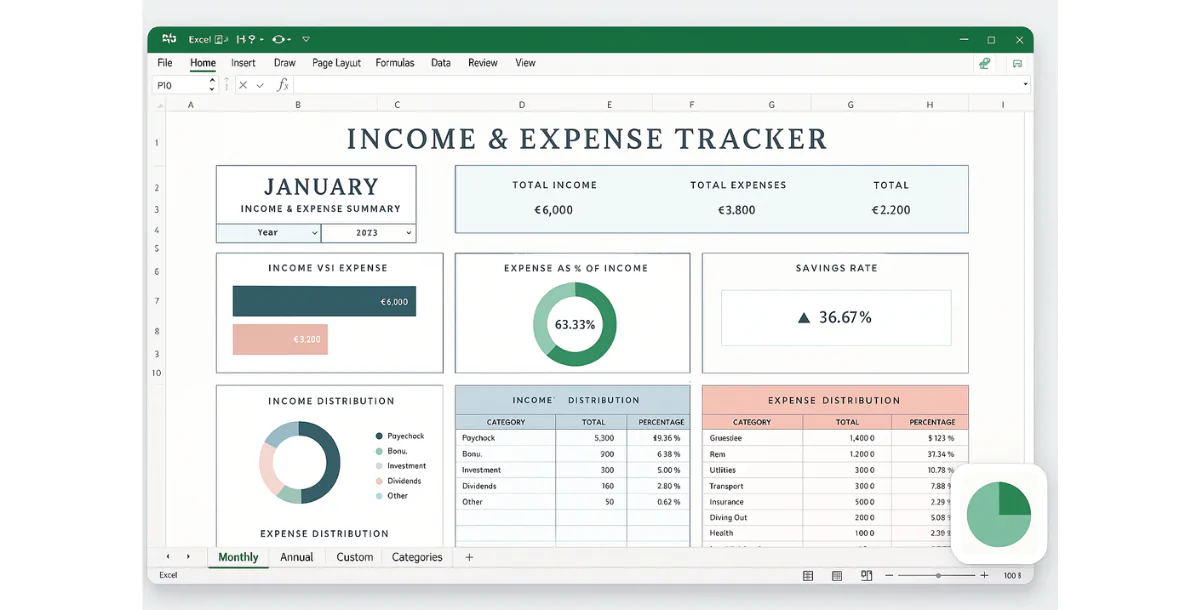 Stay in control of your money with this professional Income & Expense Tracker Excel Template. Designed for clarity and ease of use, this template gives you Monthly, Annual, and Custom dashboards so you can track your finances any way you need.