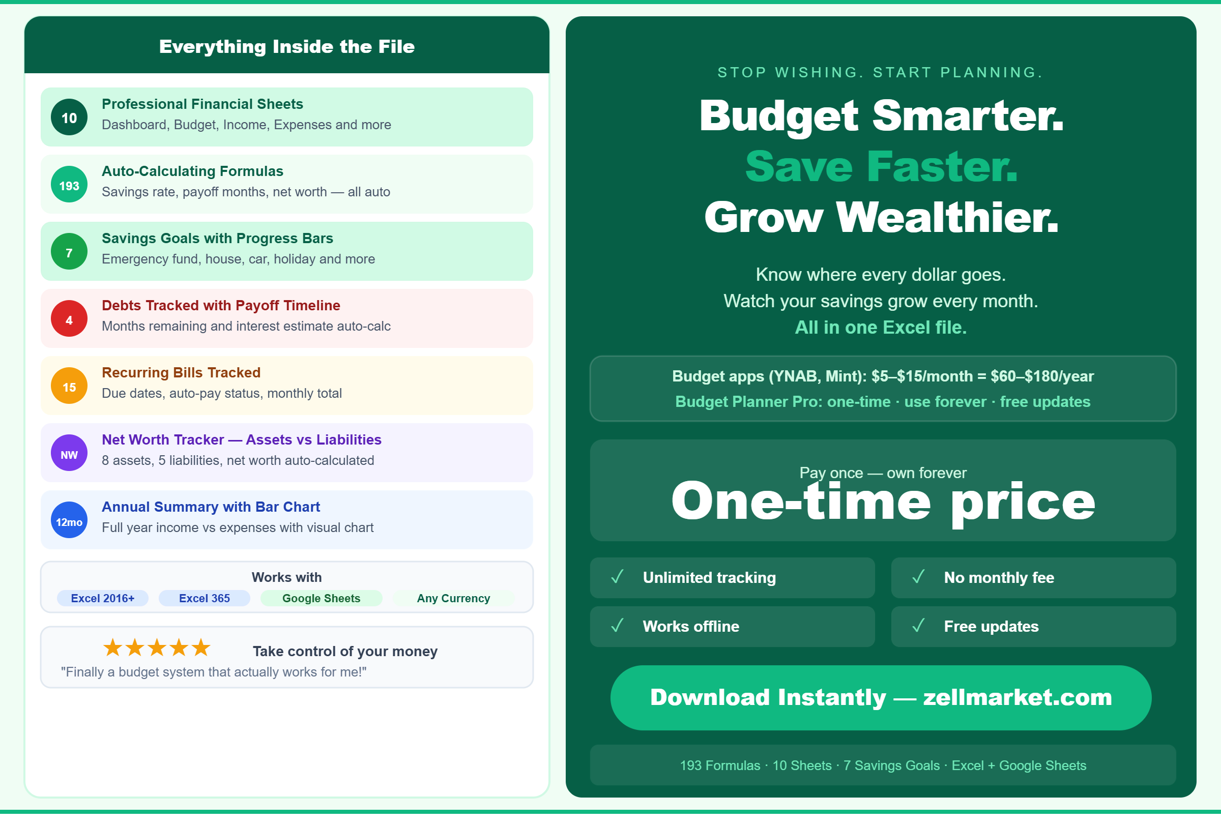Complete personal finance system in Excel. Monthly budget planner, 7 savings goals with progress bars, debt payoff tracker, bill calendar, net worth and annual summary. Works in Excel & Google Sheets.
