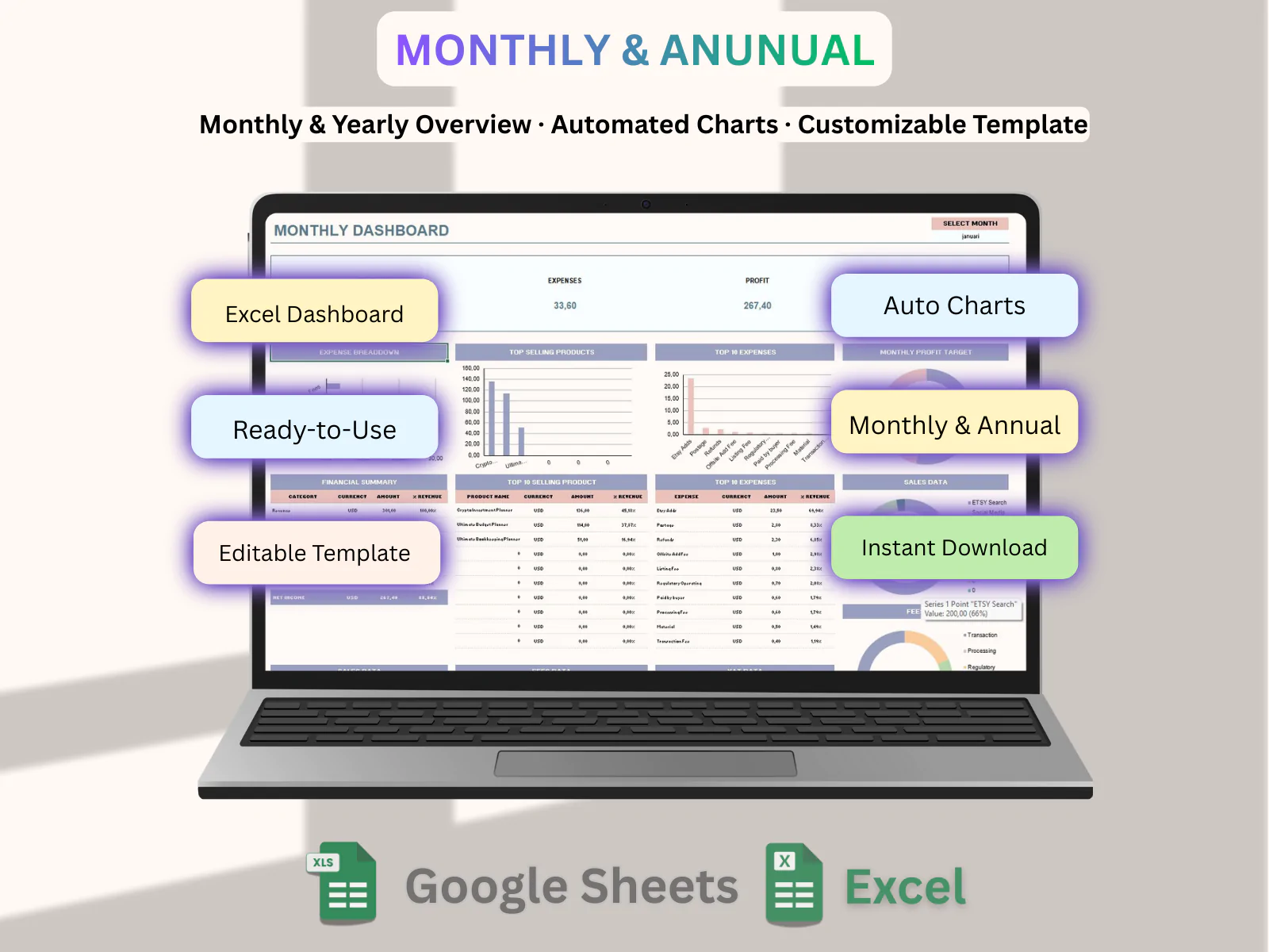 This spreadsheet focuses on simplicity, with a clean layout and minimal charts, so you can understand your expenses without stress or complicated features.