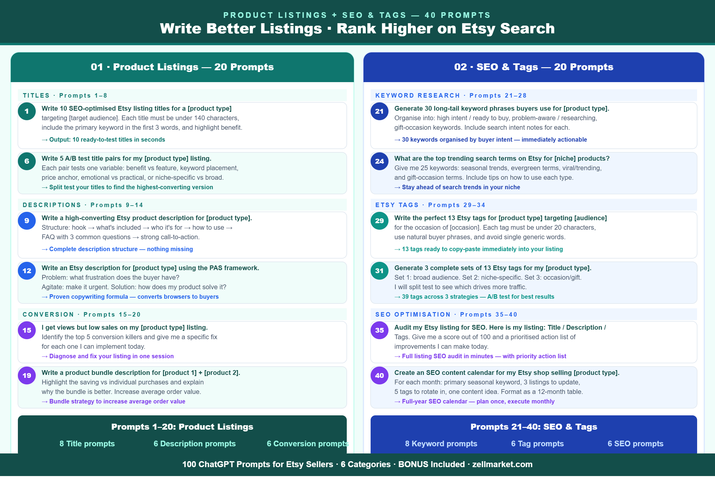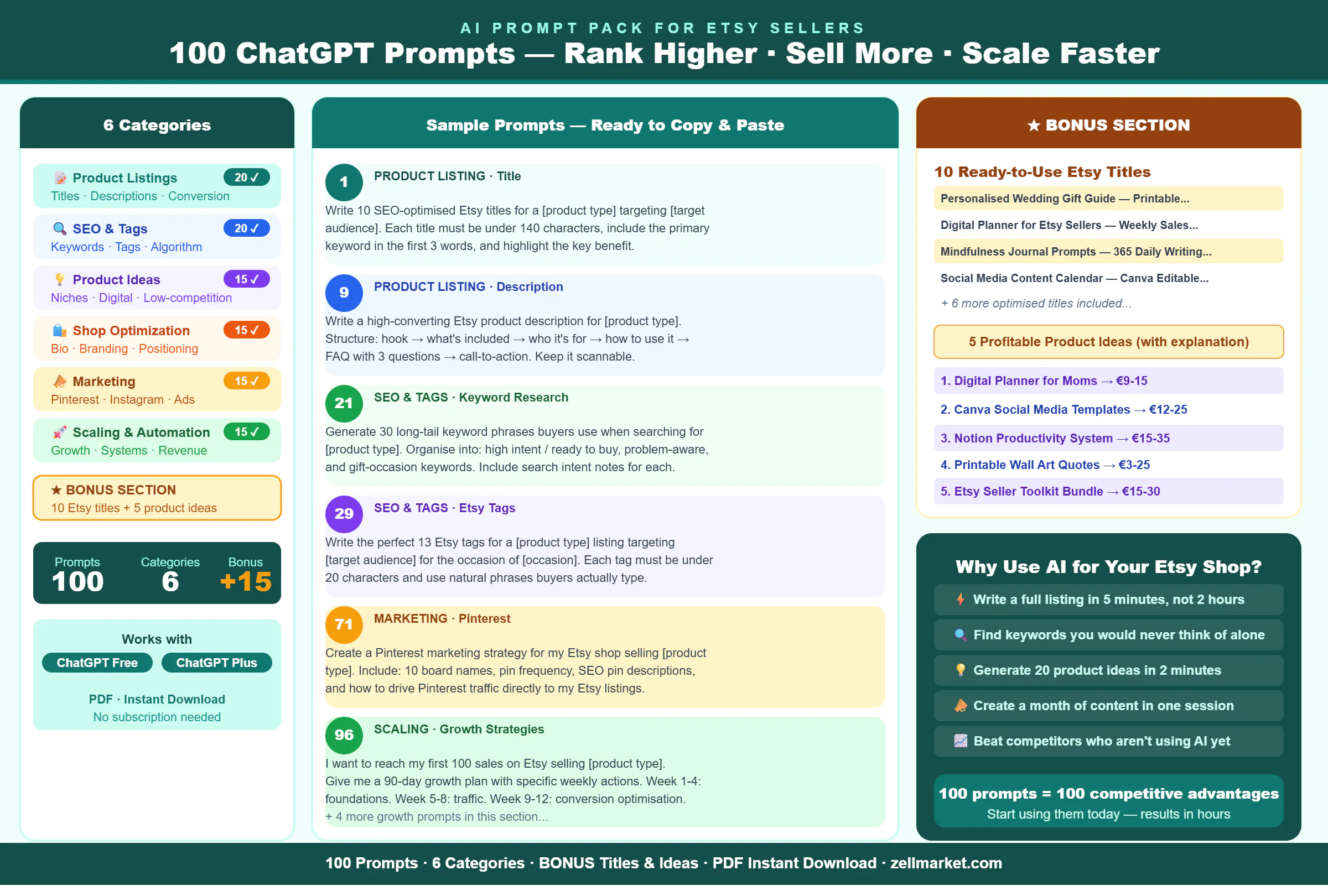 100 ready-to-use ChatGPT prompts for Etsy sellers. Write better listings, rank higher with SEO, find profitable product ideas, and grow your shop with AI. Includes BONUS: 10 Etsy titles + 5 product ideas. PDF instant download.