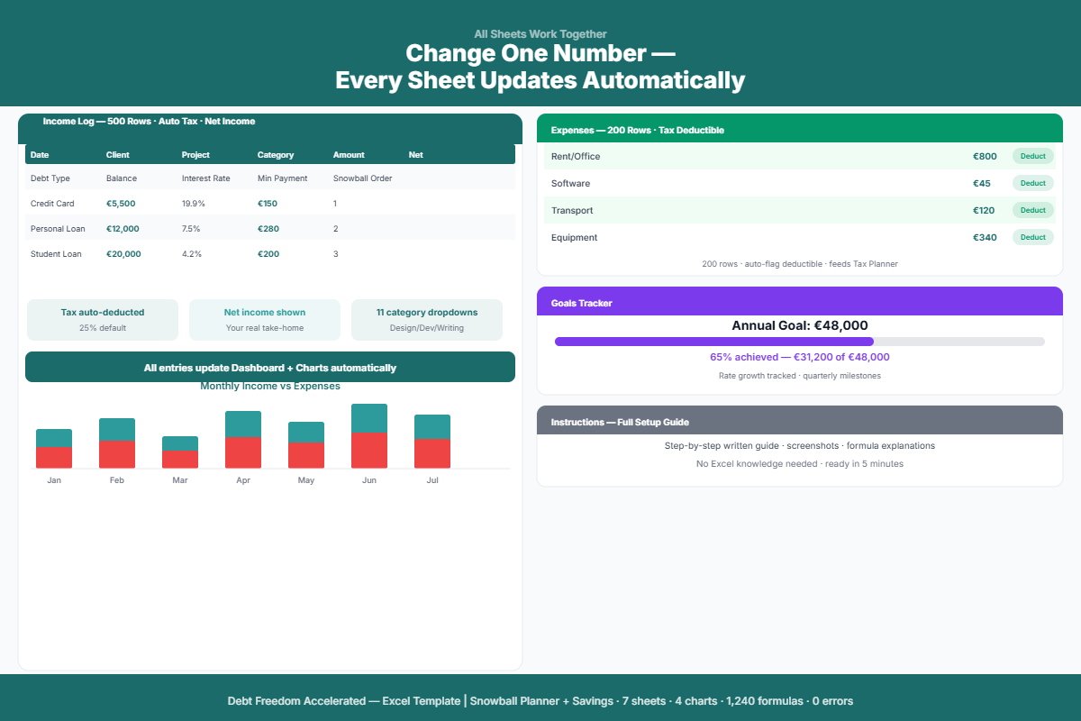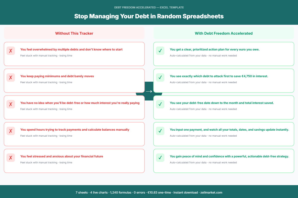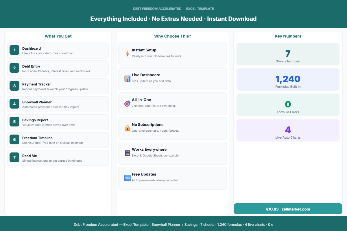 Tired of feeling trapped by debt, making minimum payments that barely scratch the surface? This Debt Snowball Spreadsheet is for the ambitious small business owner, freelancer, or side-hustler who wants to accelerate their financial freedom. Stop guessing and start seeing your path to debt-free living clearly, without complex calculations or confusing spreadsheets. Take back control, optimize your payments, and watch your debt disappear faster than you thought possible.