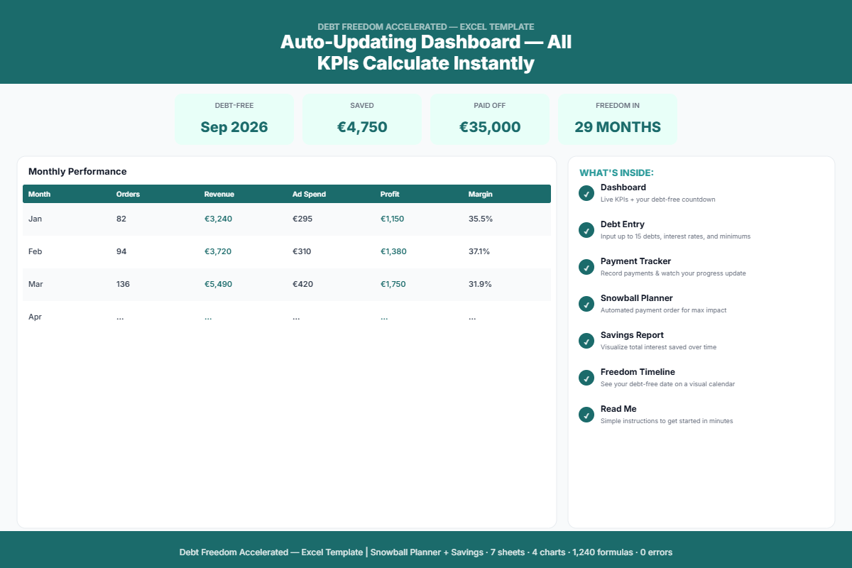 Pay off €35,000 in 29 months — and save €4,750 in interest with zero stress.