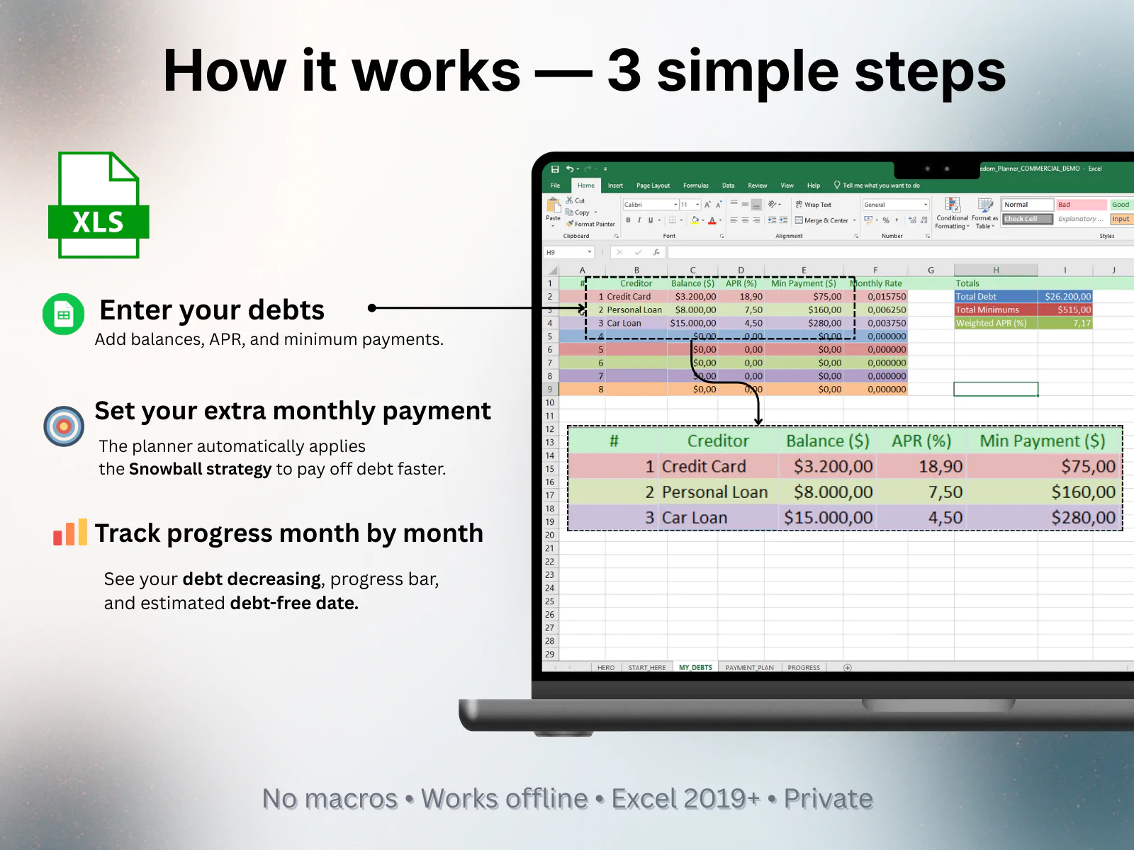 The Debt Freedom Planner (Excel) is a professional, easy-to-use spreadsheet designed to help you pay off debt faster using the proven Snowball Method — without complicated formulas or risky macros.