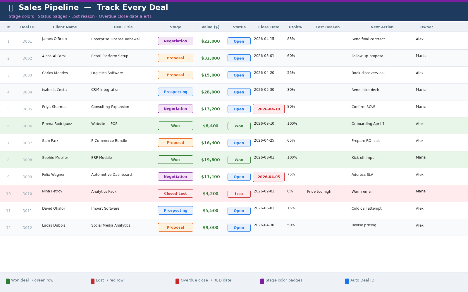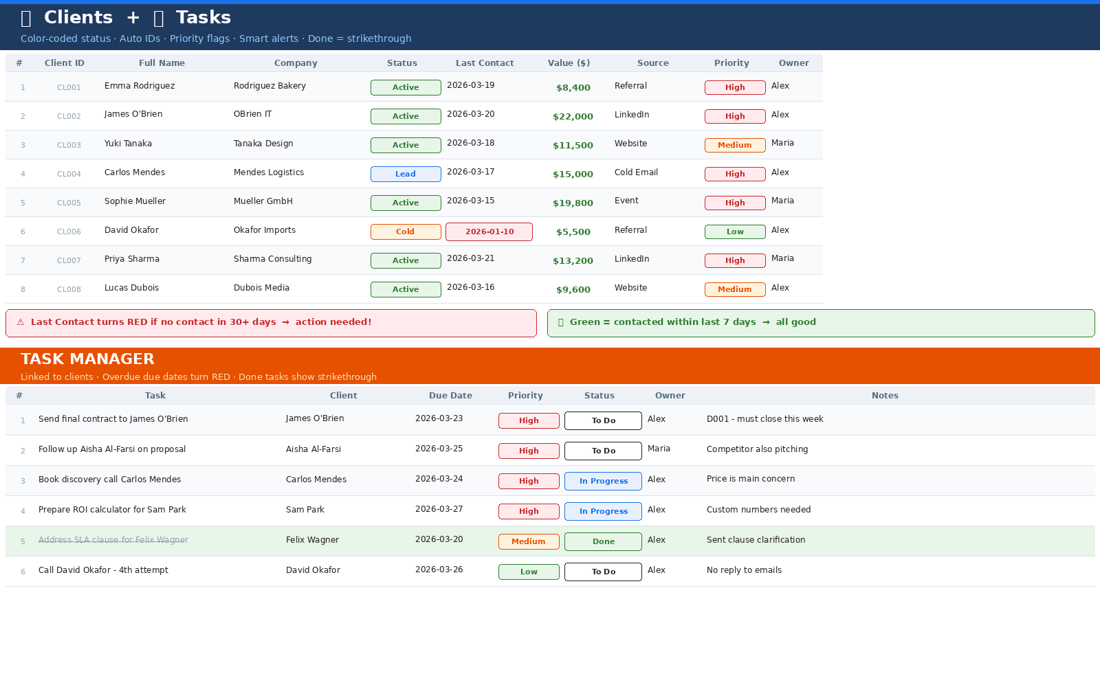 Complete CRM system in Excel. Track clients, manage deals, log interactions and never miss a follow-up. Color-coded, dropdown menus, smart alerts, live dashboard. Works in Excel & Google Sheets. Demo data included.